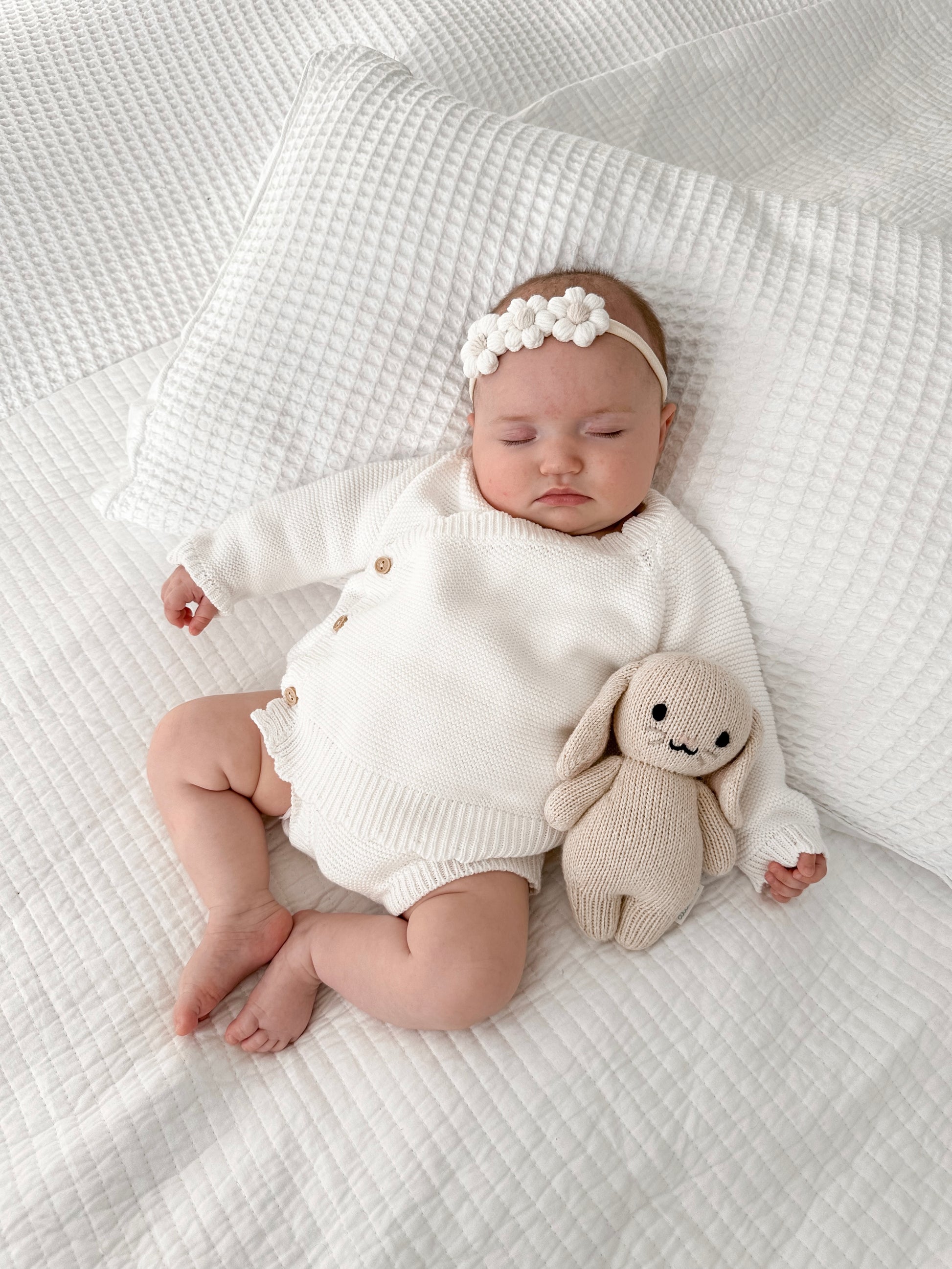 Crochet Daisy Headband in White & Beige - a beautiful accessory for your baby girl.