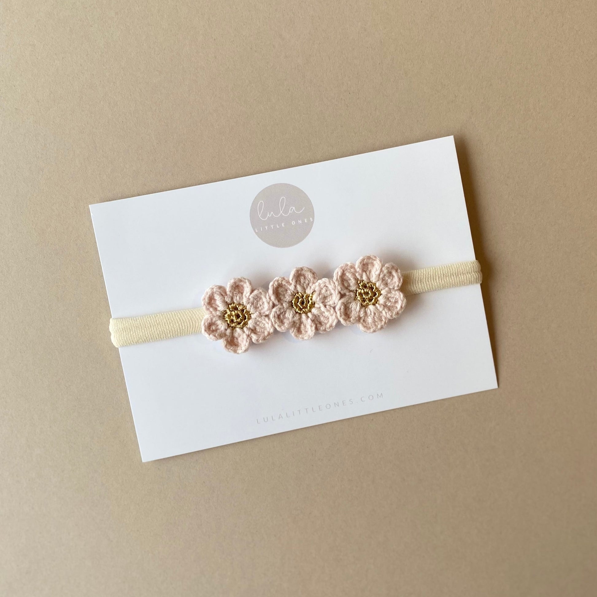 Crochet Flower Headband in Pink & Gold - a beautiful accessory for your baby girl.