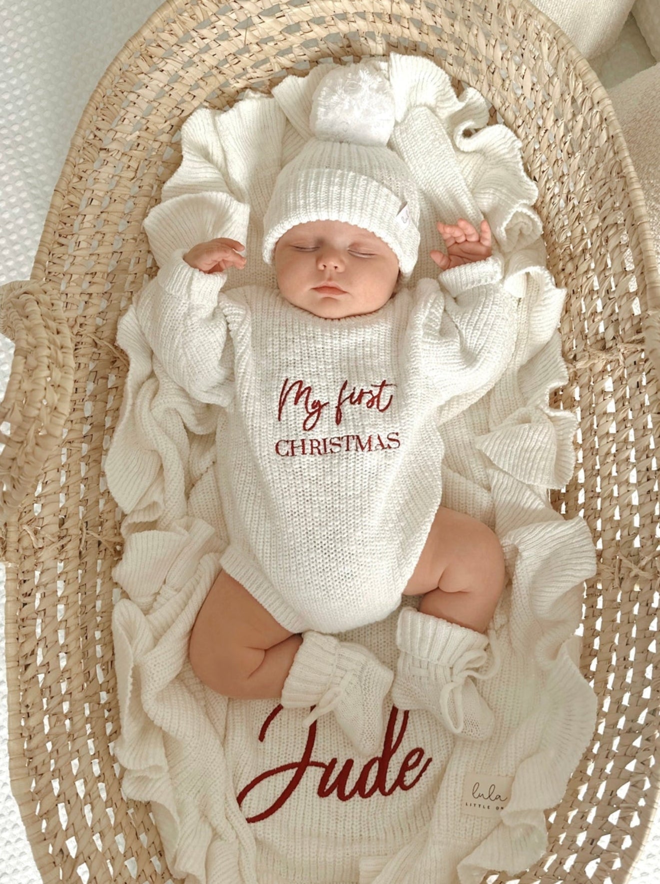 Wrap your little one in festive cosiness with our Personalised Christmas Chunky Knit Blanket 🤍 Crafted from 100% textured cotton in our timeless ivory shade, this luxuriously soft blanket features a frill edge and chunky knit design. Finished with deep red embroidery, it makes a beautiful keepsake for your baby’s first Christmas.