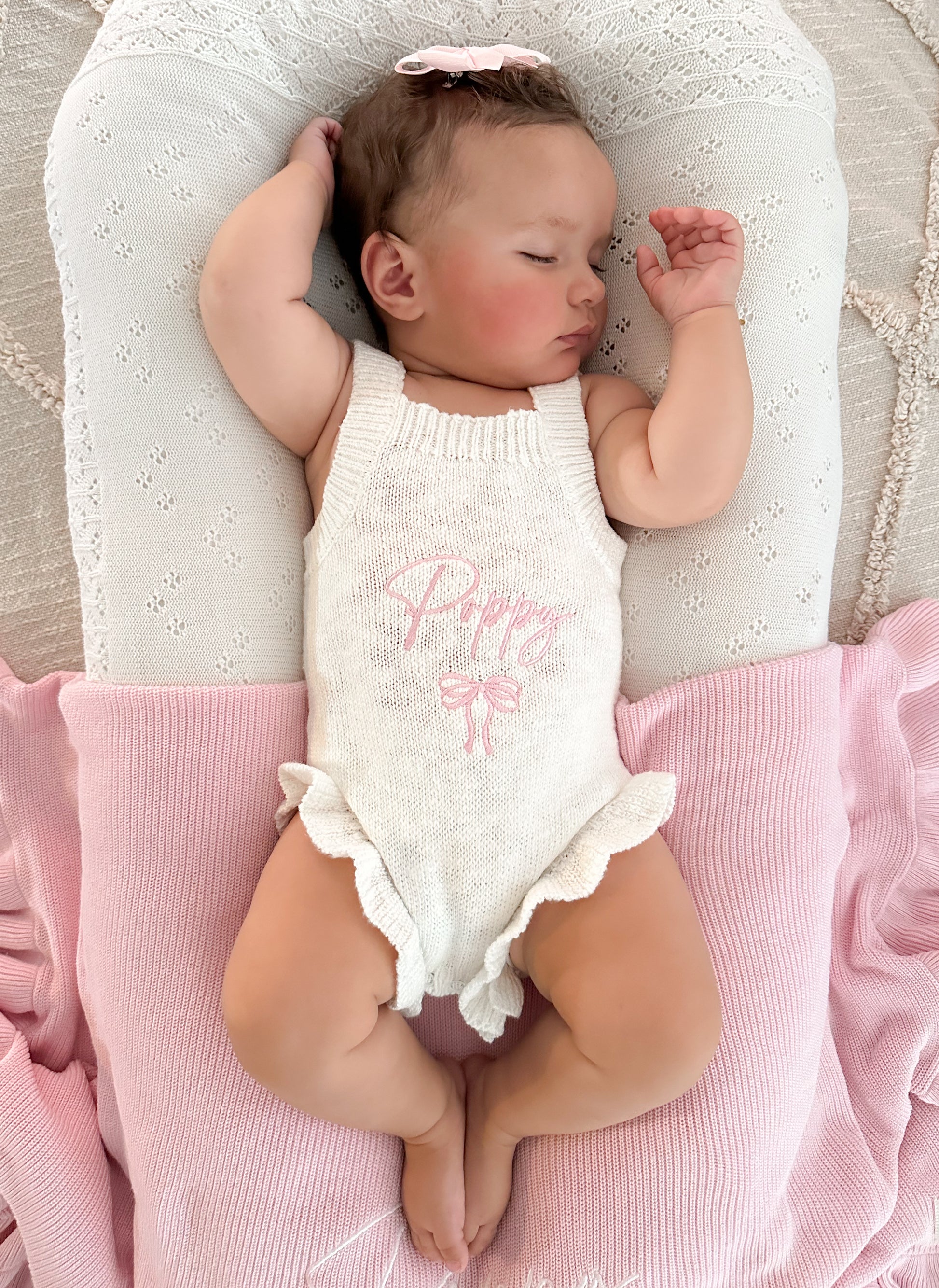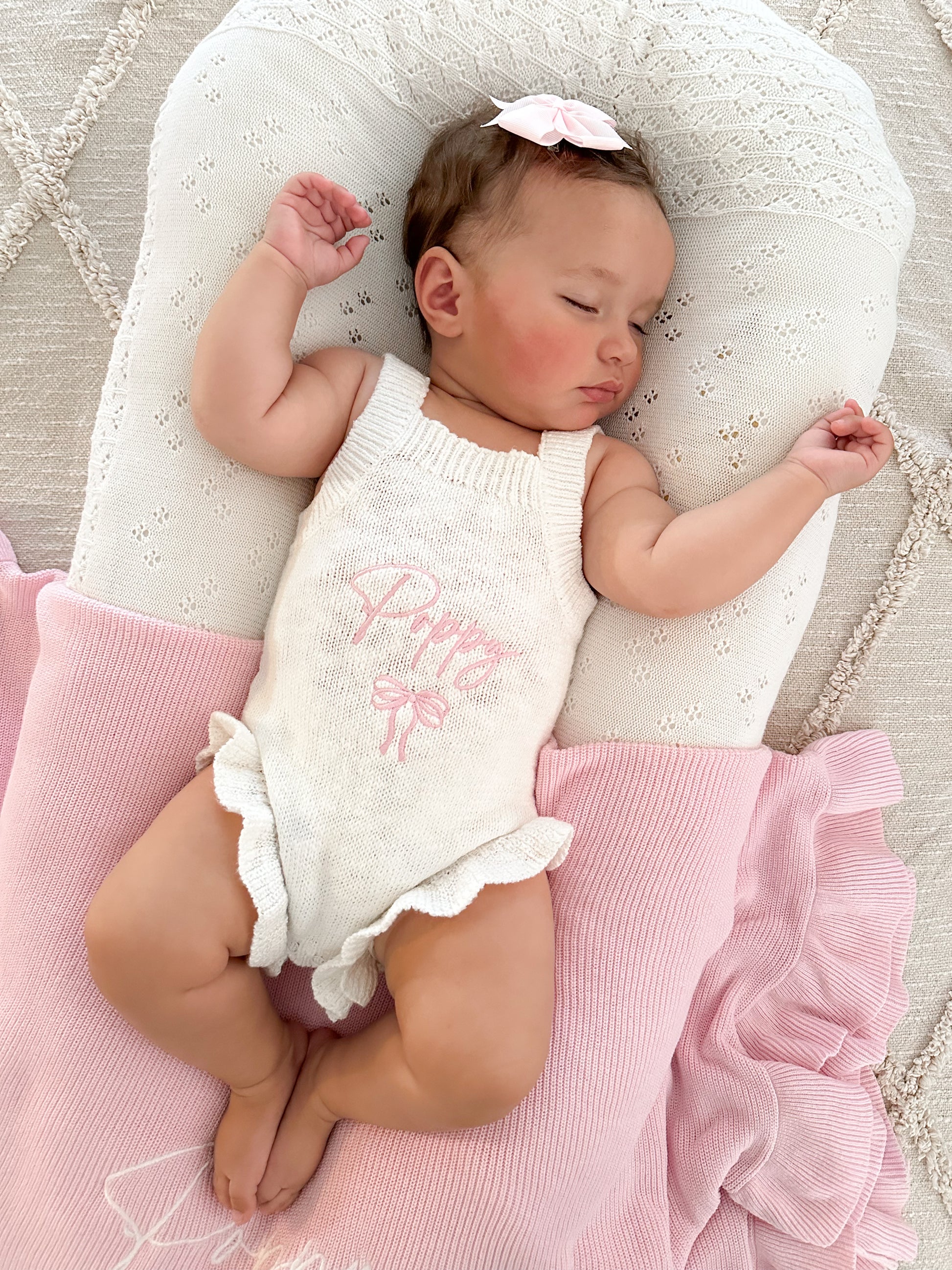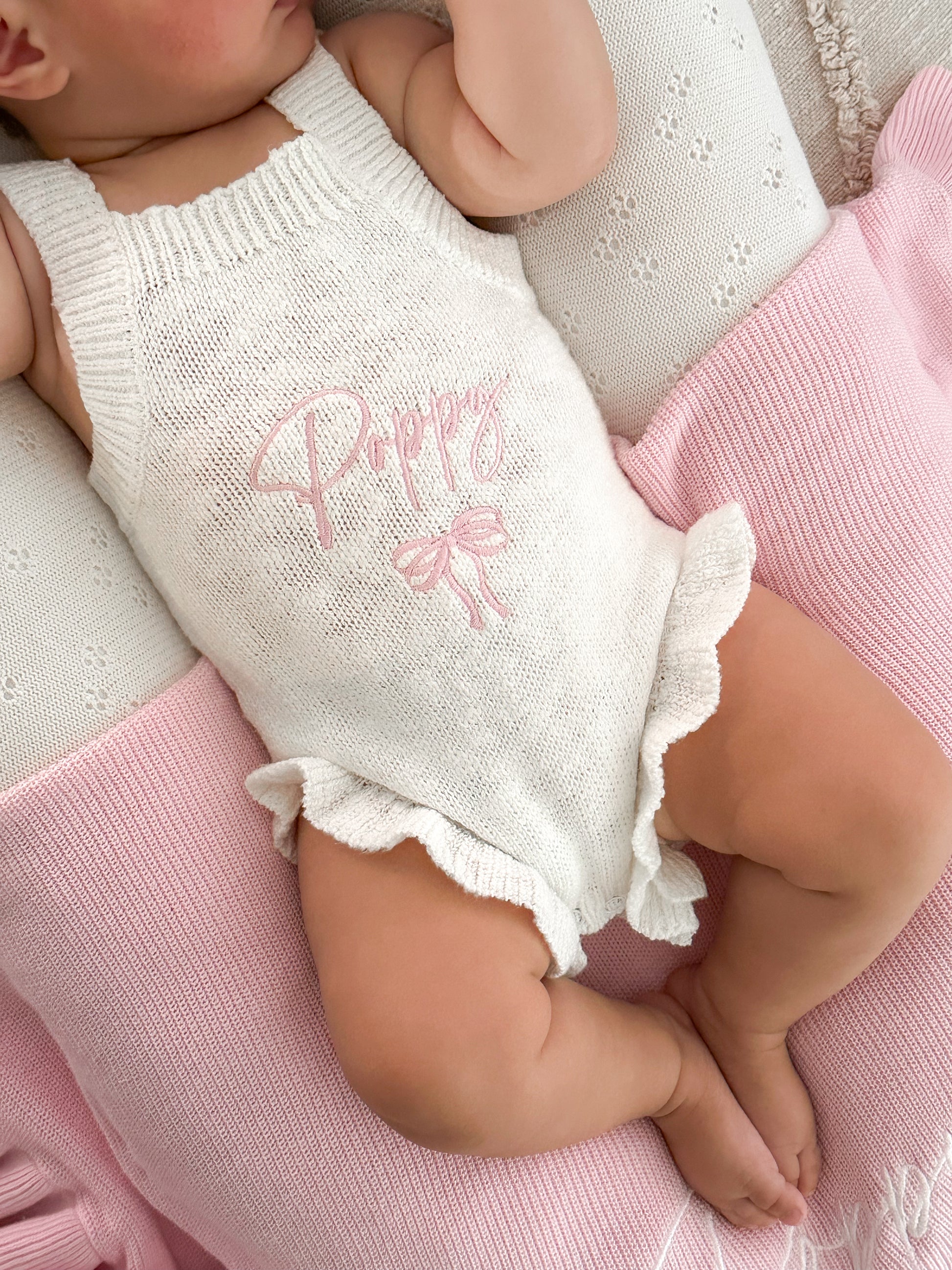 📸 Pictured: 'Poppy' romper – Thread: Pink, Font: Cherish