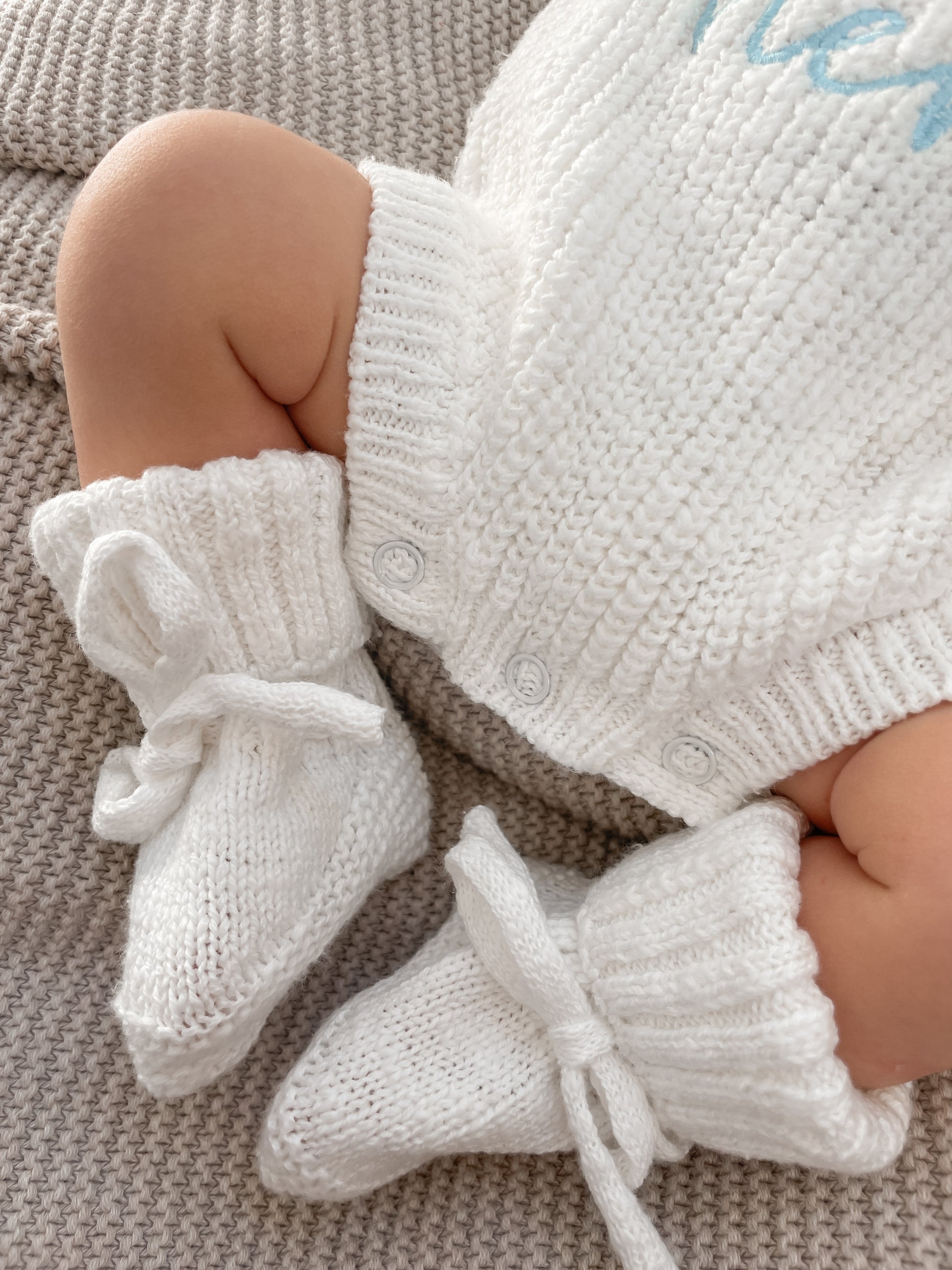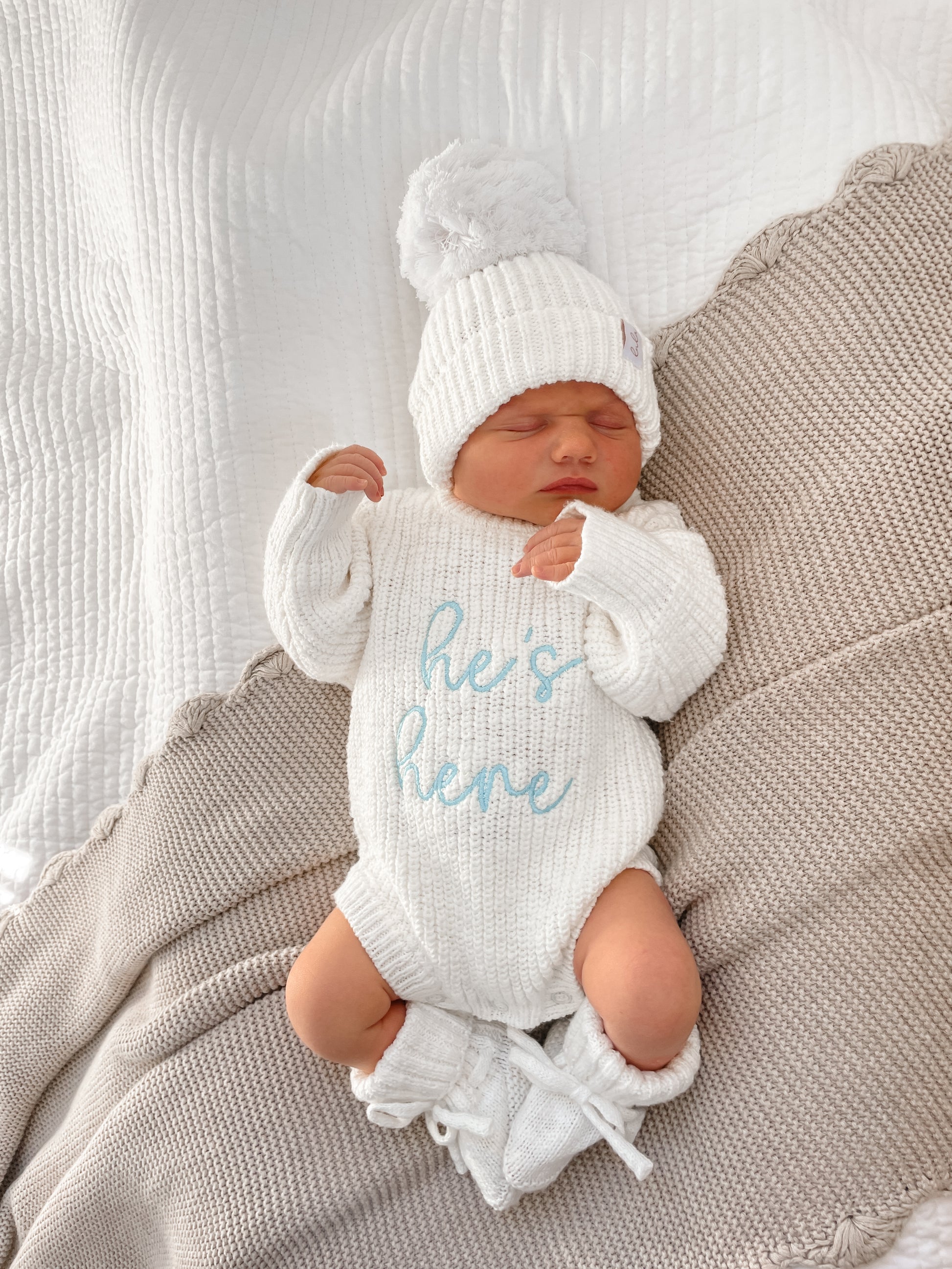 Set | He's Here | Chunky Knit Baby Romper & Booties & Hat | Ivory