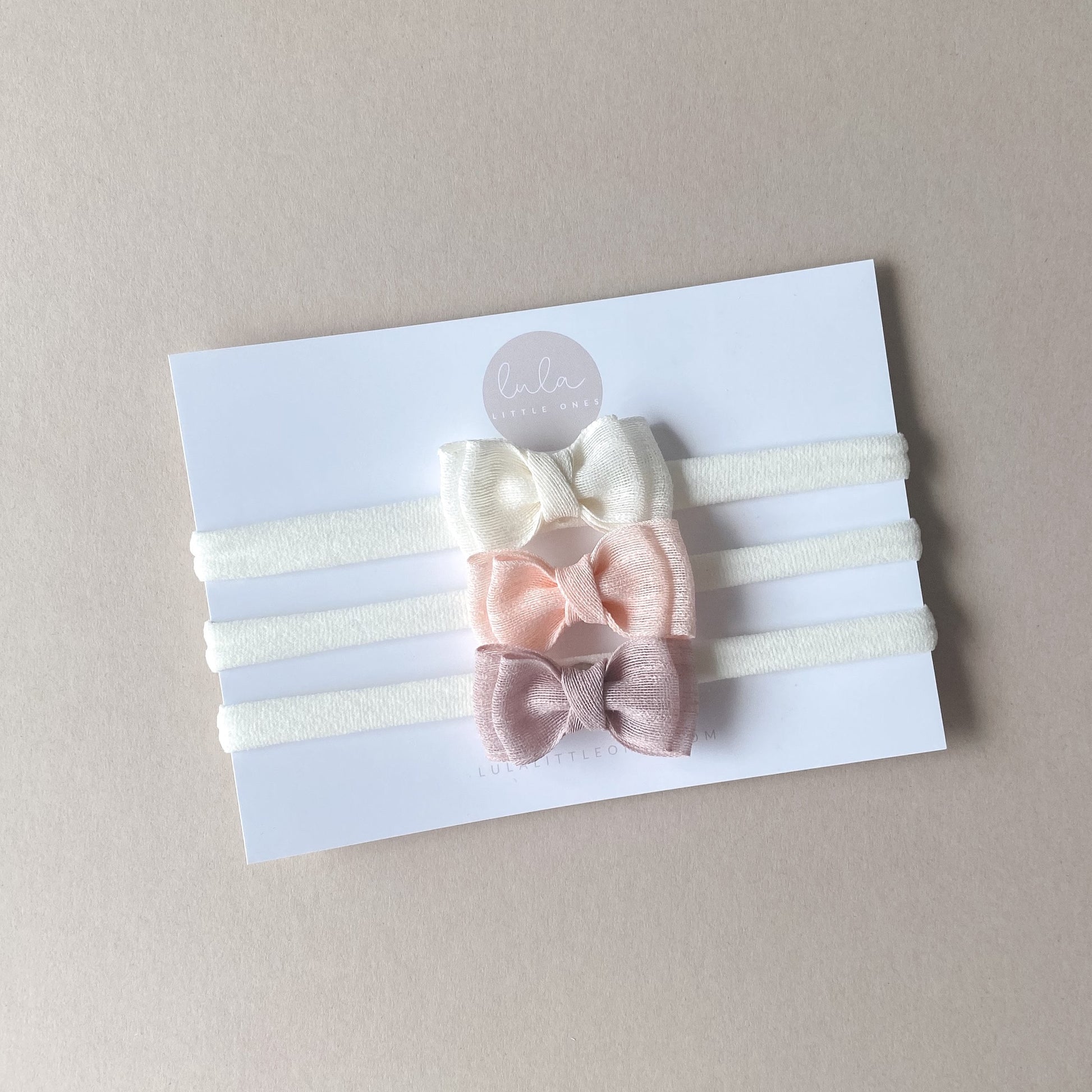 A beautiful set of three dainty headbands featuring cotton bows in Ivory, blush and Lilac. These gorgeous bows come on super stretchy headbands to fit a range of sizes comfortably.